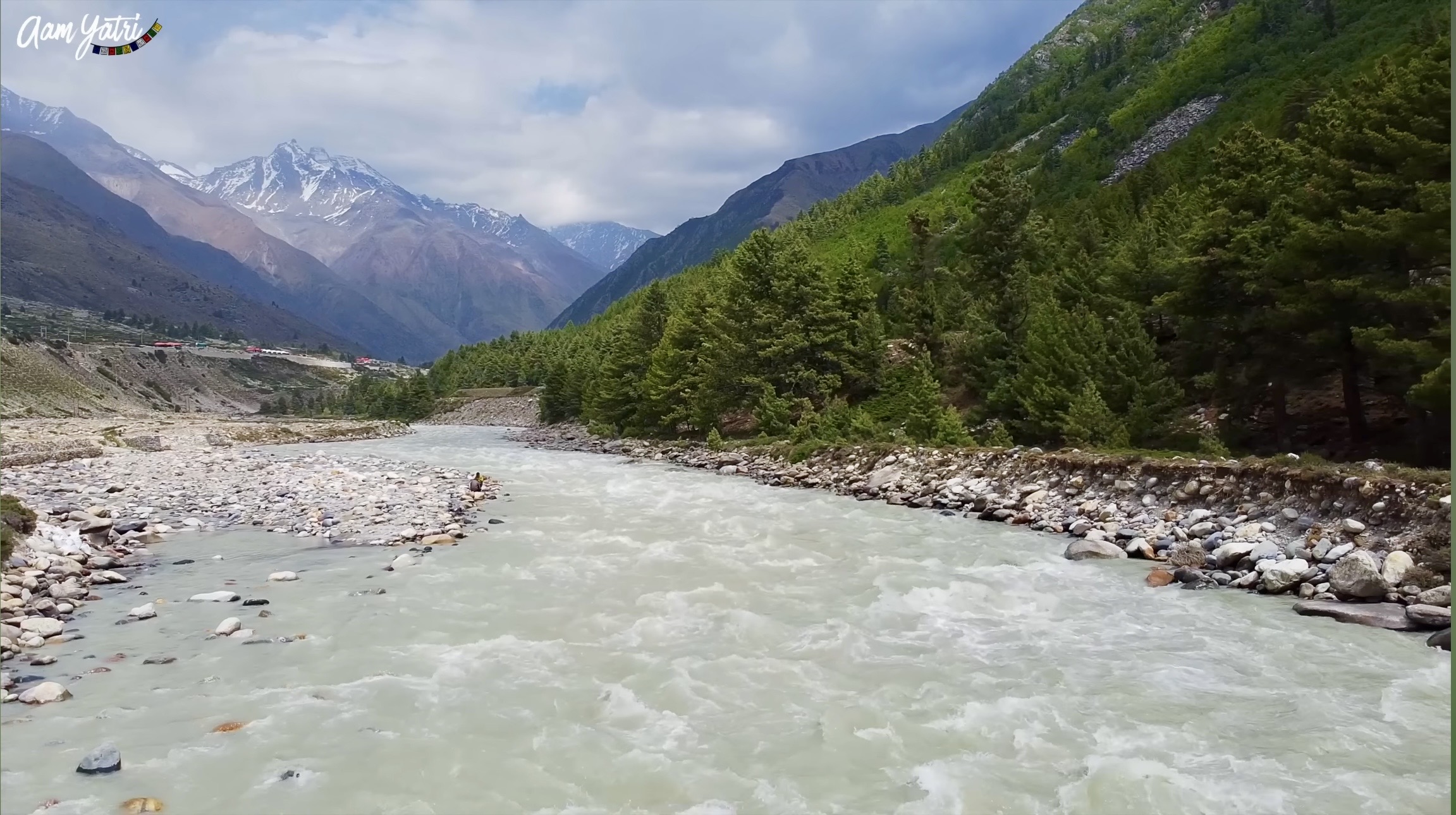 The Baspa River begins to accompany you like a constant presence — sometimes calm, sometimes aggressive — cutting through the valley with a sound that becomes part of the journey itself. Snow patches appear in the distance. Pine trees line certain sections before slowly giving way to more rugged, barren terrain.