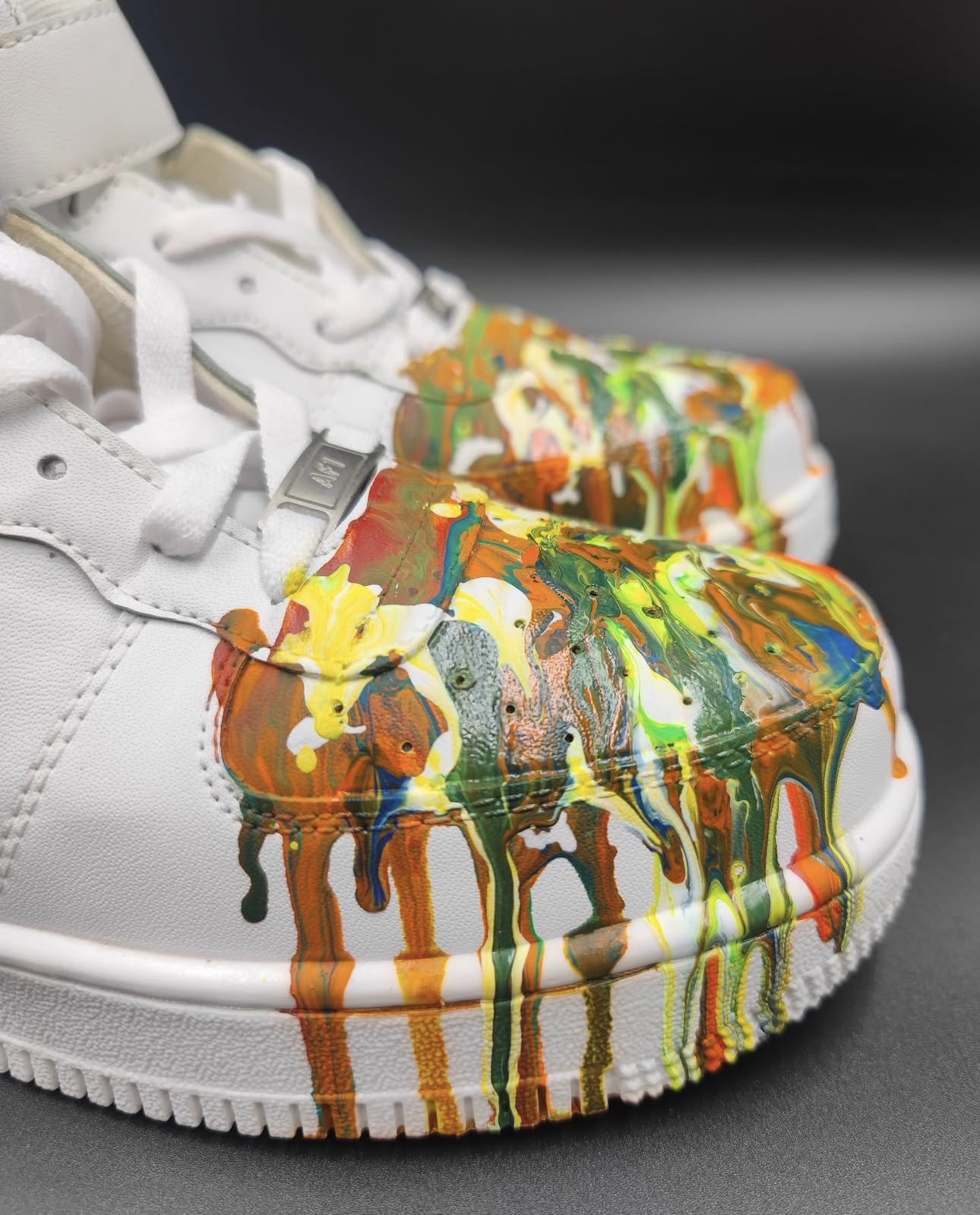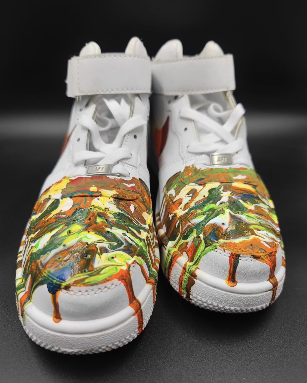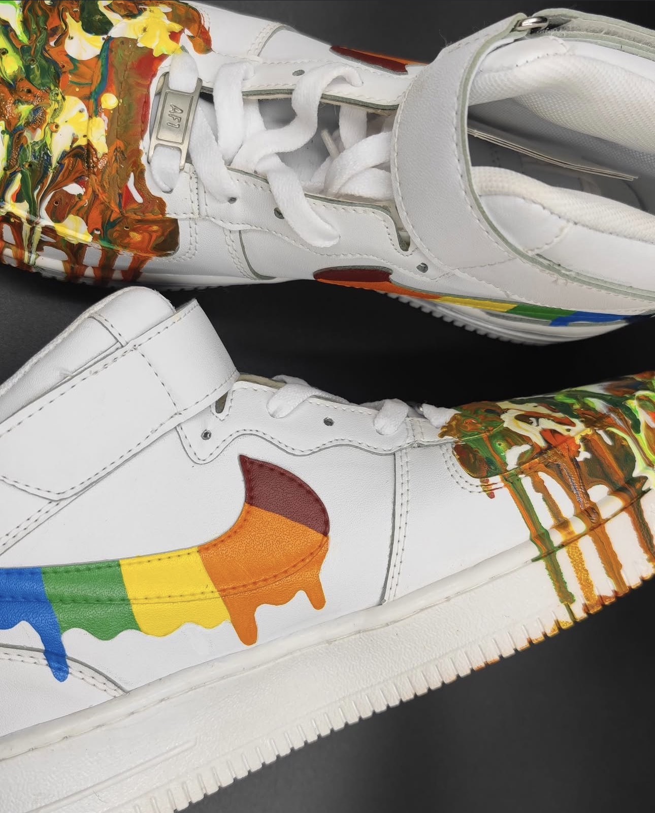 A fluid hand-painted composition created for bold visual expression. Built as wearable art, this pair carries layered paint movement and strong handcrafted individuality.